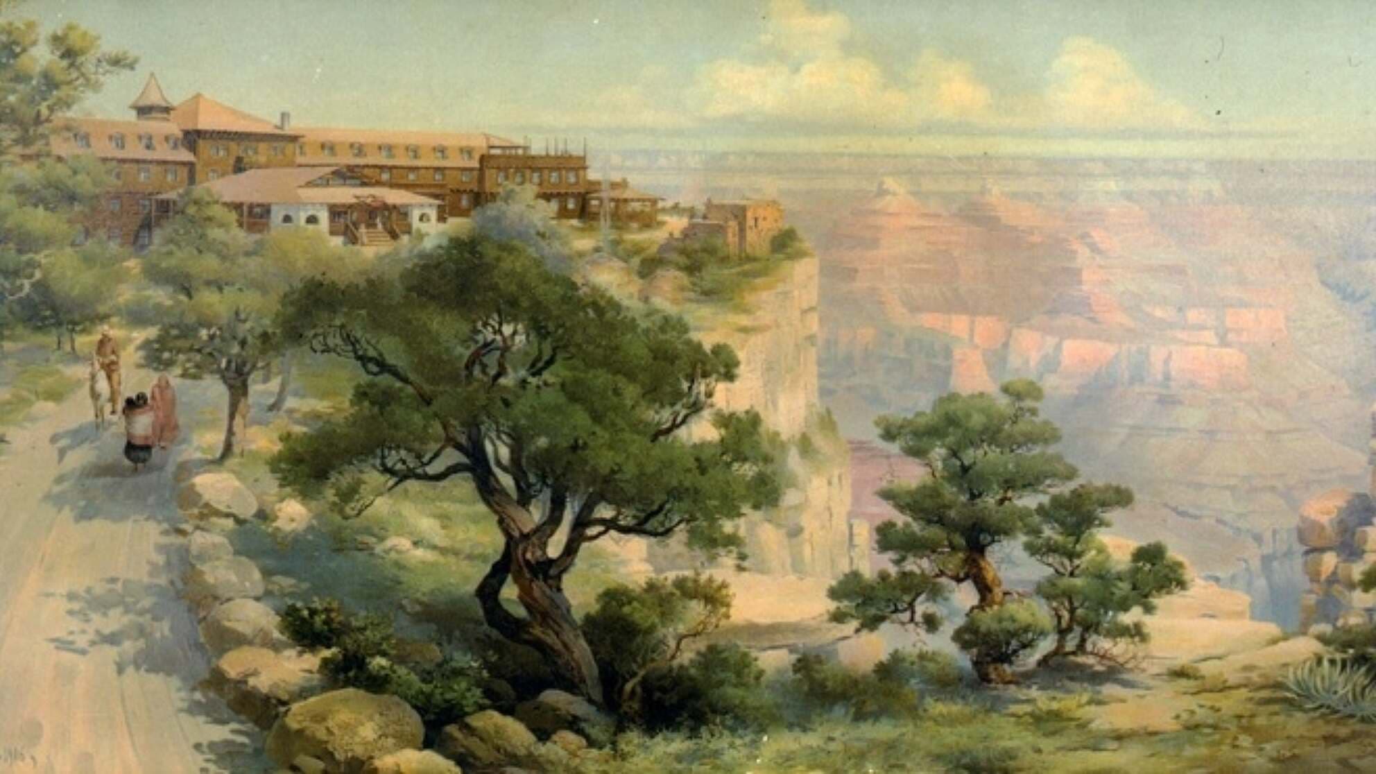 Framed print of a popular Louis Akin painting of the El Tovar hotel and Hopi House on the South Rim. Date: 1906.